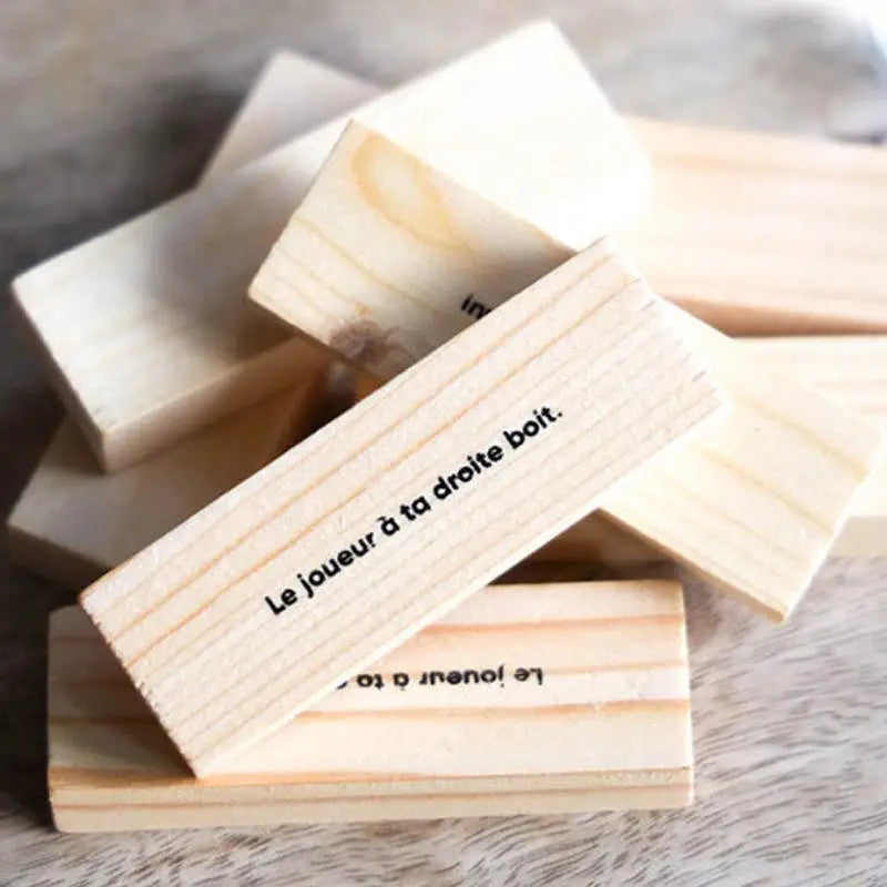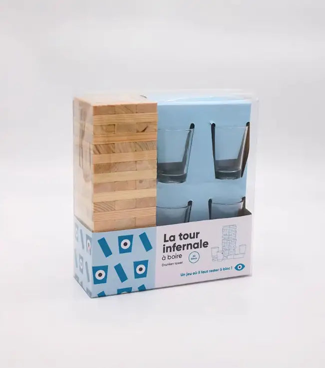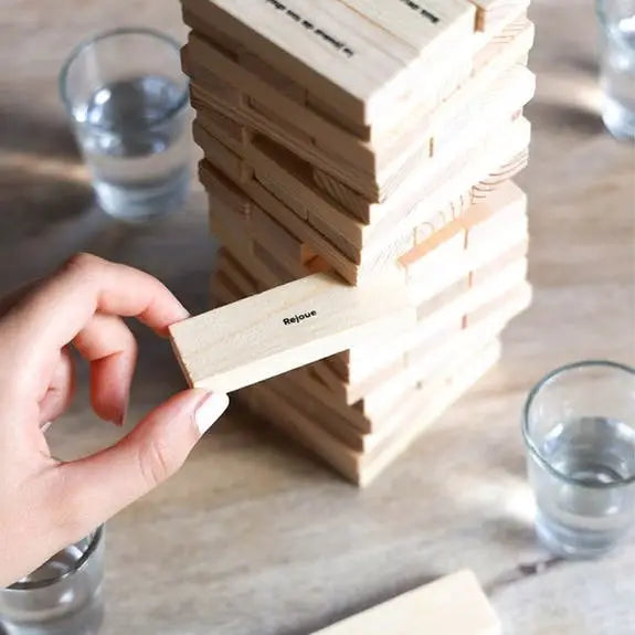 The Tower of Doom drinking game transforms your evenings into guaranteed laughter and fun! 🎉🍻 This complete set includes 4 glass shot glasses and 60 pine wood planks (30 pre-set actions + 30 blank ones to personalize). Stack the tower, remove the planks one by one, and complete the challenges without making it all collapse! Easy to understand and incredibly fun, this drinking game combines skill, strategy, and creativity for memorable evenings with friends. Customize your challenges, test your dexterity, and get ready for unforgettable, shared laughter.