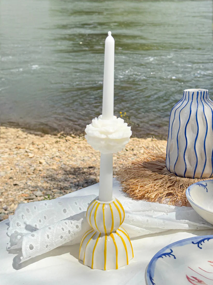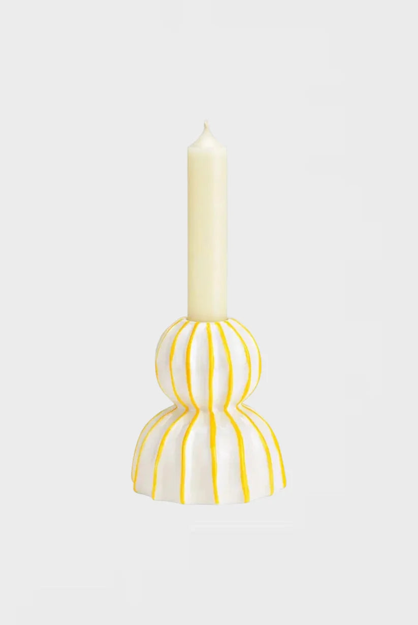 Ce bougeoir en céramique brillante blanche avec ses rayures jaune vif, sa forme double boule ultra sculpturale et sa base évasée en étoile, c'est une vraie petite sculpture lumineuse pour votre table. 🕯️