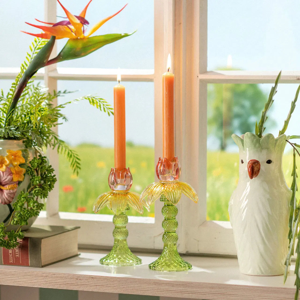 Bougeoir tulipe en verre — vert, jaune & rose