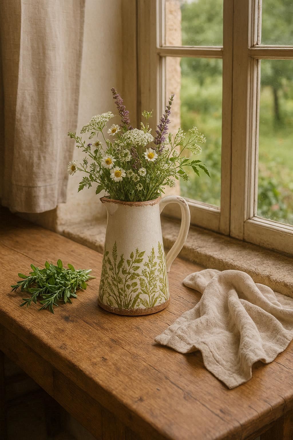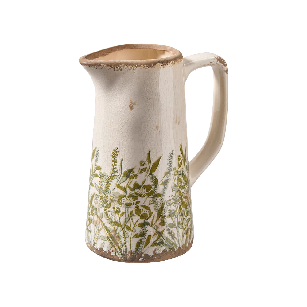Ce pichet en céramique craquelée crème, orné d'un délicat motif de plantes sauvages et de fougères peint en vert naturel sur le bas, a tout d'une pièce chinée dans une vieille ferme du Luberon. 🏡