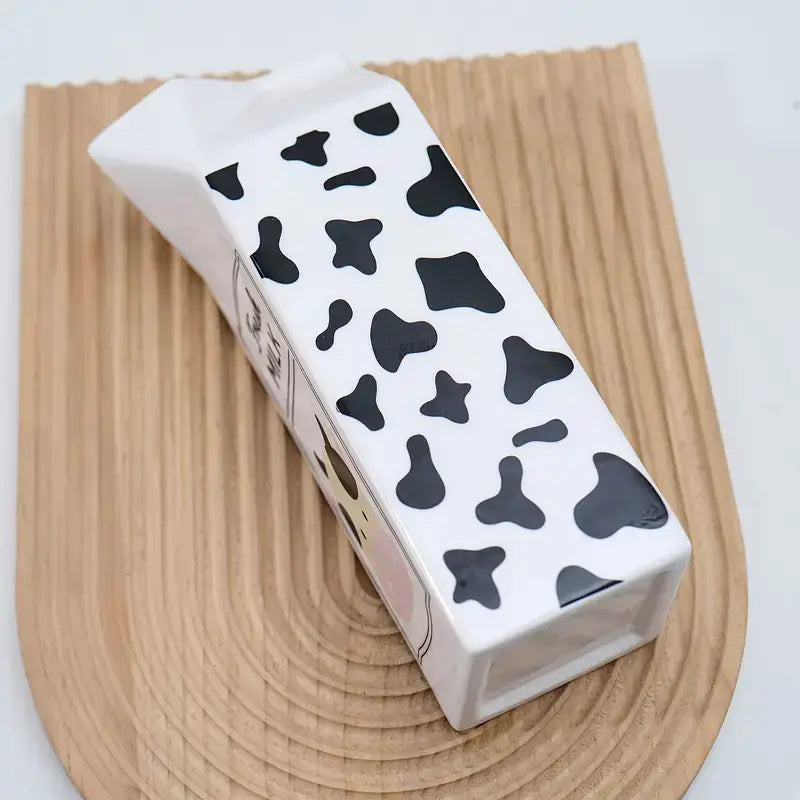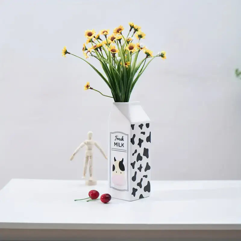 - Note ludique artistique : Imprimé vache ajoute humour subtil et dimension créative transformant vase utilitaire en œuvre d'art décorative